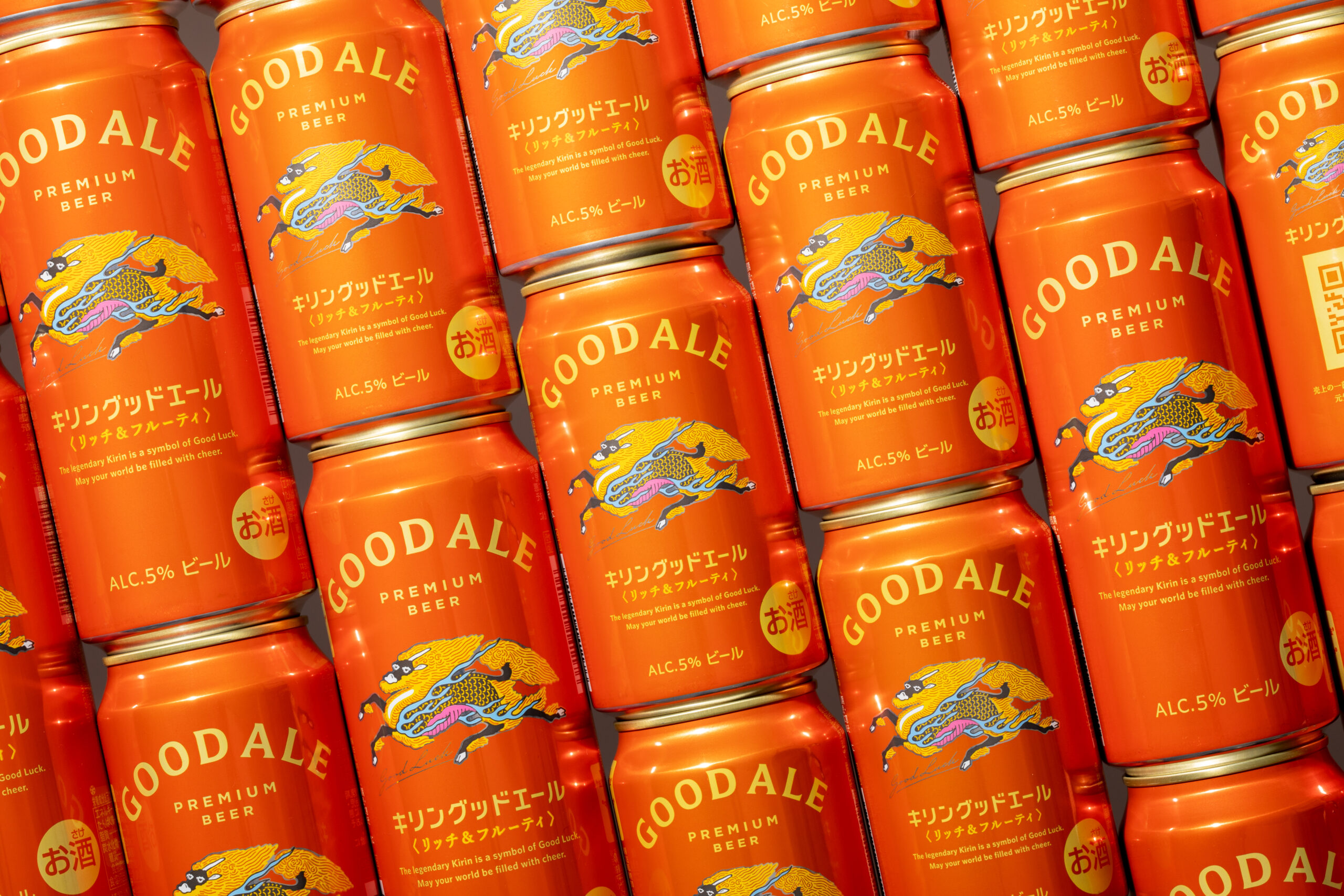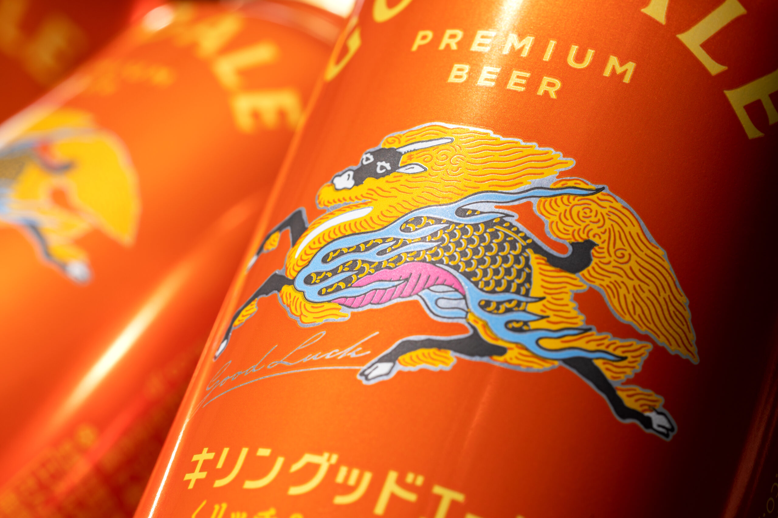 まったく新しいキリンビールのパッケージデザインは、中心に特別感のある聖獣麒麟が輝く。「Good Luck」のメッセージサインを携え、ニュアンスのあるボディカラーに輝くシルエットは、まるで未来から幸せを運ぶために舞い降りてきたかのよう。虹のようにアーチを描くGOOD ALEはオリジナルロゴタイプからコミュニケーションフォントへと昇華しました。それ自身が「幸せの象徴」であるかのようなパッケージデザインは、クライアントを中心とするクリエイティブチームの想いが込められた結晶です。